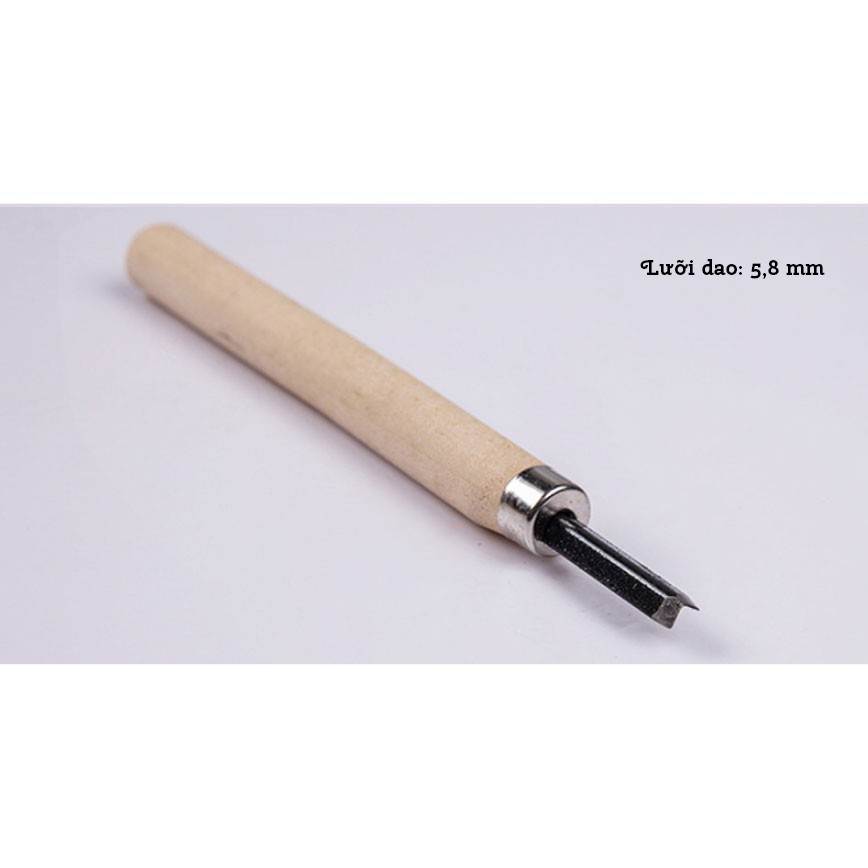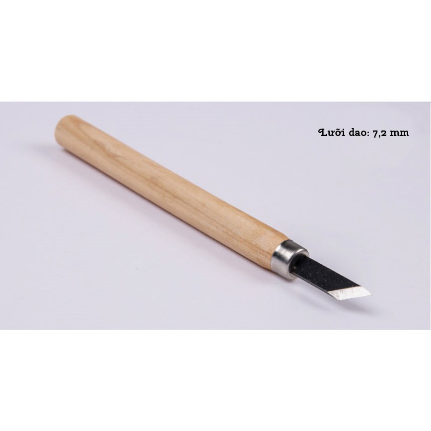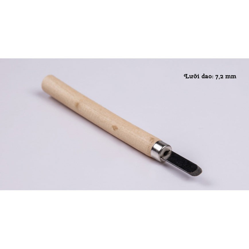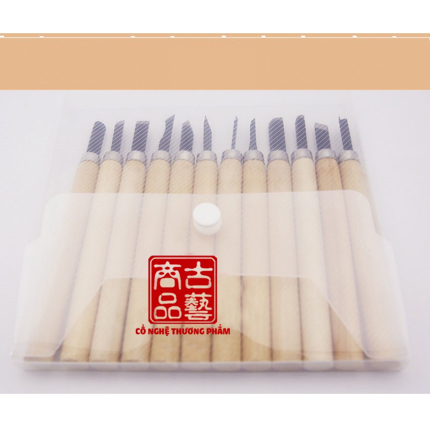 Sản phẩm gồm 12 dụng cụ khắc gỗ.Lưỡi dao bằng kim loại thân gỗ tròn, cầm chắc tay và sắc bén. Ngoài khắc gỗ, dụng cụ còn có thể khắc đá để phục vụ làm con dấu, ấn triện.