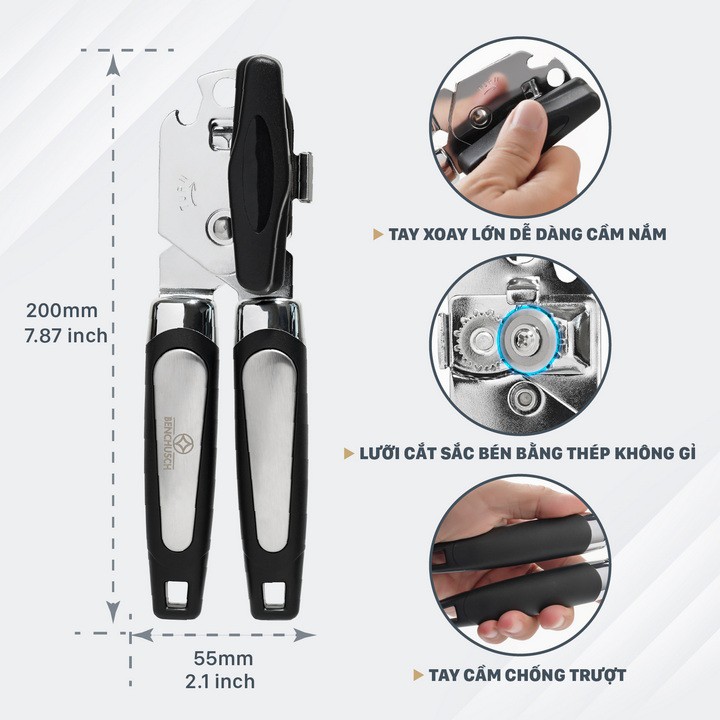 - Dụng cụ khui hộp Benchusch được làm từ thép không rỉ chất lượng cao với vòng bánh răng và lưỡi cắt sắc bén mang đến hiệu quả cắt hoàn hảo, đơn giản và nhanh chóng. Bên cạnh đó, sản phẩm còn tích hợp chức năng khui nắp chai/lon tiện dụng giúp bạn ‘chinh phục’ tất cả các loại nắp hộp/lon/chai một cách dễ dàng.