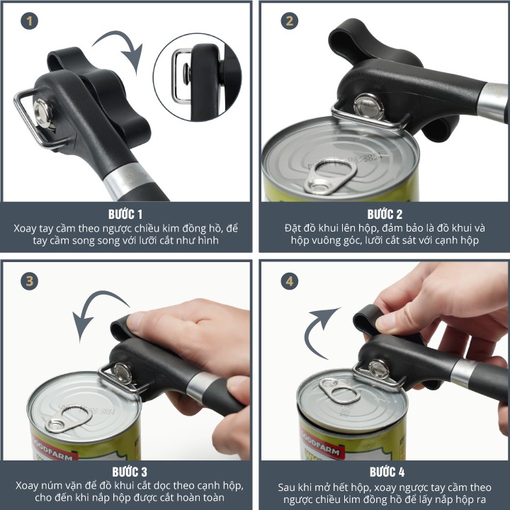 - Tay cầm bằng nhựa ABS cứng cáp với thiết kế cong thái học độc đáo được bọc lớp silicon mềm tăng khả năng chống trượt tối ưu, giúp cố định hộp cũng như tạo lực đủ mạnh giúp bạn thao tác mở nắp hộp/lon một cách dễ dàng.