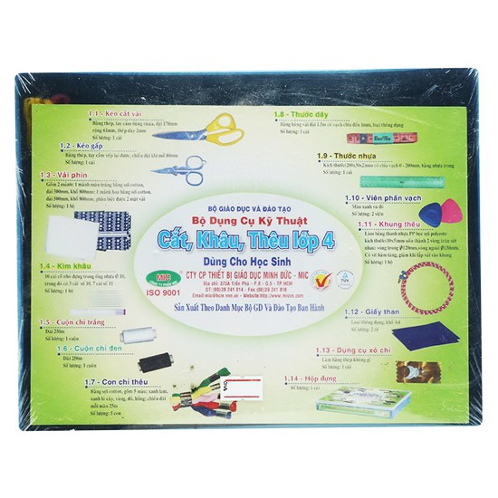 Gồm đầy đủ dụng cụ cắt, khâu, thêu cần thiếtBộ sản phẩm bao gồm 14 dụng cụ đầy đủ, cần thiết trong môn học cắt, khâu, thêu lớp 4: