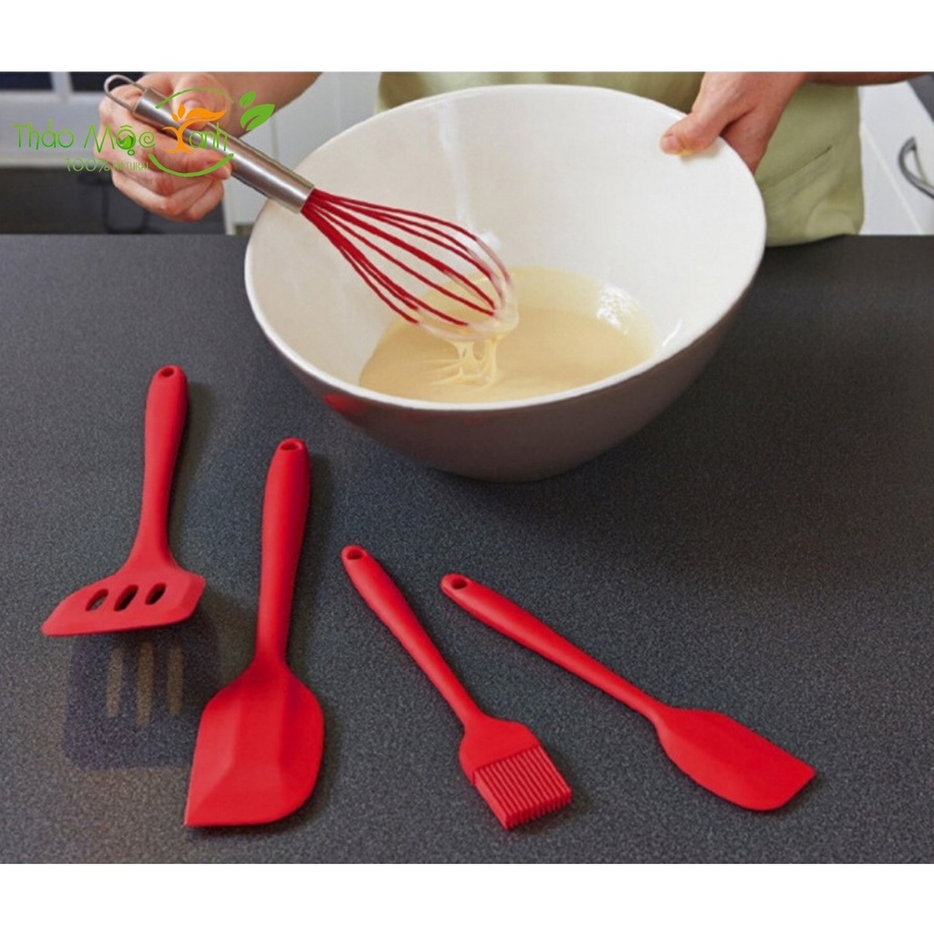 - Bộ 5 dụng cụ cơ bản bếp bánh sử dụng chất liệu silicon cao cấp không gây độc hại, có khả năng chịu nhiệt tốt từ -40℃ - 230℃. Sản phẩm có màu đỏ nổi bật, không làm trầy xước hoặc hư hỏng lớp chống dính của khuôn hay nồi chảo. Chất liệu không bám dính, thao tác đơn giản, linh hoạt.