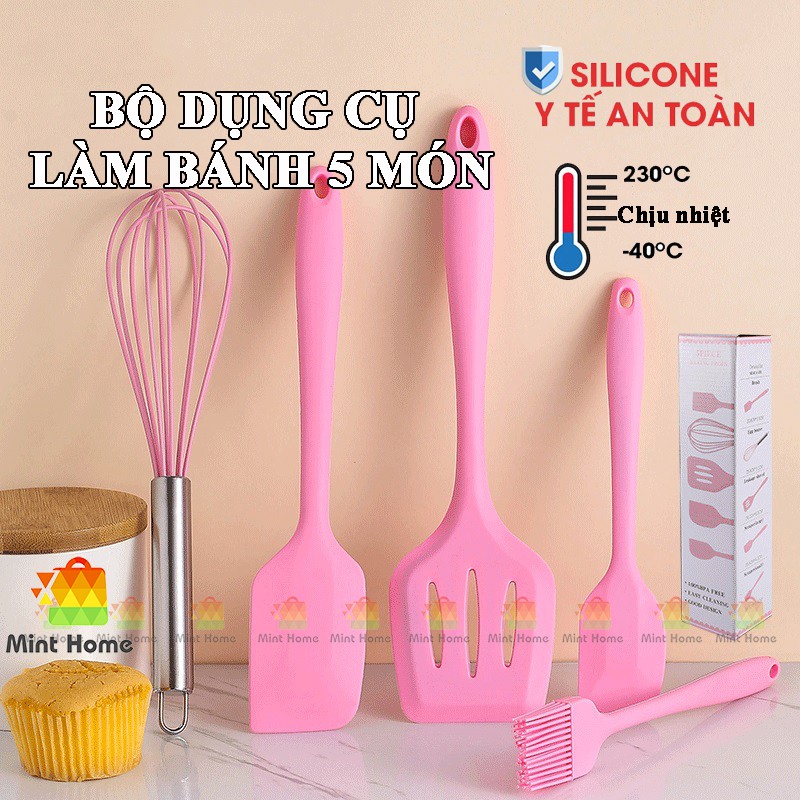 Bộ dụng cụ làm bánh 5 món silicon, nấu ăn, trà sữa, chè gồm chổi, spatula trộn bột, đánh trứng, xẻng silicone chịu nhiệtAn toàn cho sức khỏe, thân thiện với môi trường.