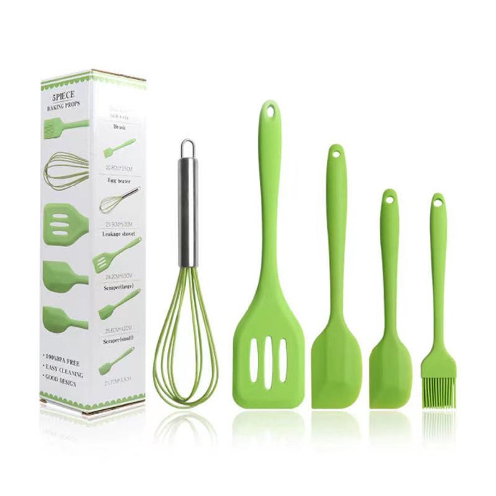 - Bộ 5 dụng cụ làm bánh được làm từ silicone an toan kết hợp với tay cầm bằng INOX tạo nên sự bền chắc của bộ dụng cụ làm bánh.