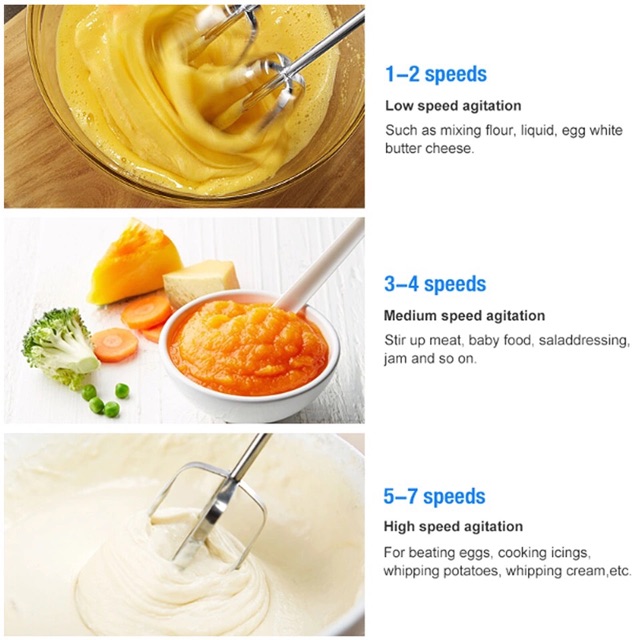 – Mức 5: Dùng để trộn hỗn hợp để làm bánh, đồ ăn nhanh như bánh mỳ, bánh Flan..
