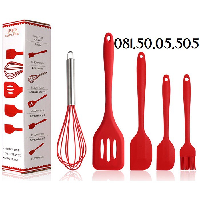 - Bộ 5 dụng cụ cơ bản bếp bánh sử dụng chất liệu silicon cao cấp không gây độc hại, có khả năng chịu nhiệt tốt từ -40℃ - 230℃. Sản phẩm có màu đỏ nổi bật, không làm trầy xước hoặc hư hỏng lớp chống dính của khuôn hay nồi chảo. Chất liệu không bám dính, thao tác đơn giản, linh hoạt.