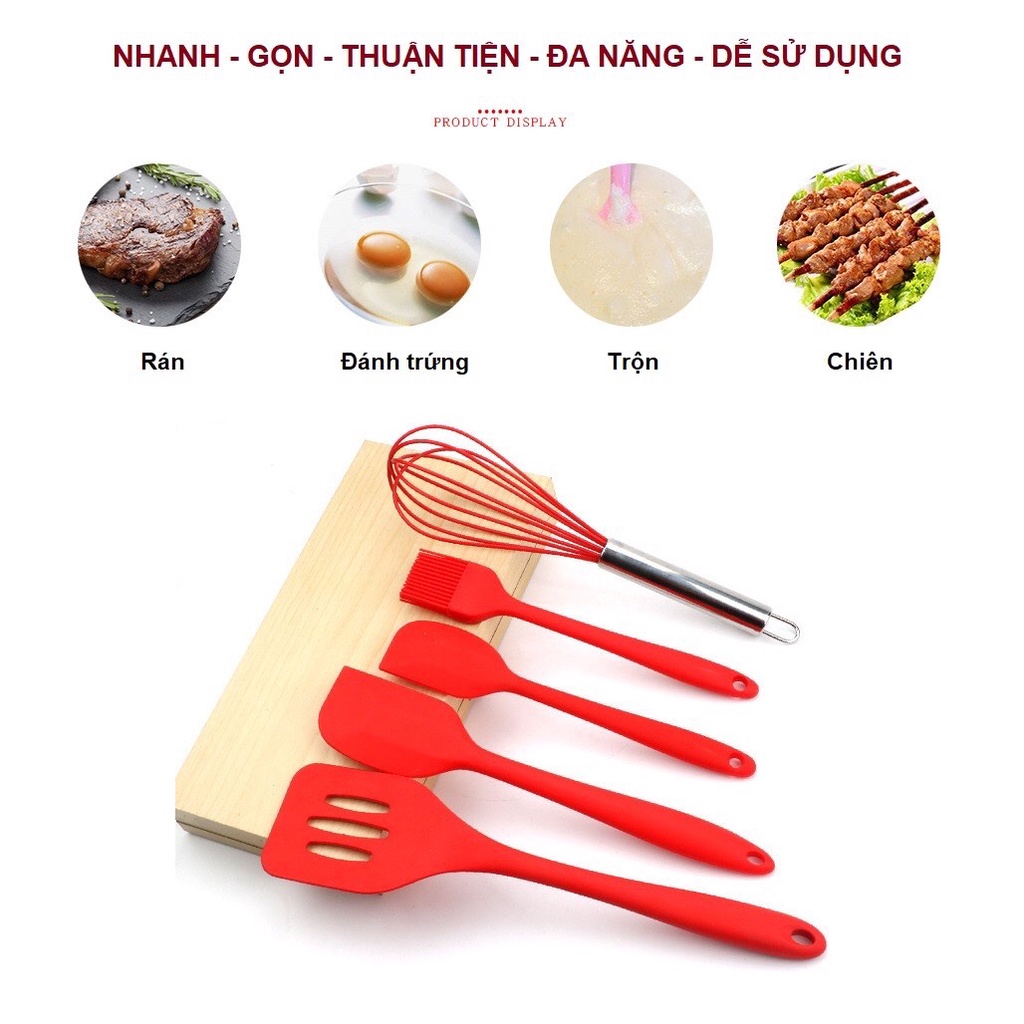 * Chất liệu silicon* Bộ gồm 5 món: vét bột lớn, vét bột nhỏ, khuấy lòng, chuổi phết, vá chiên xào