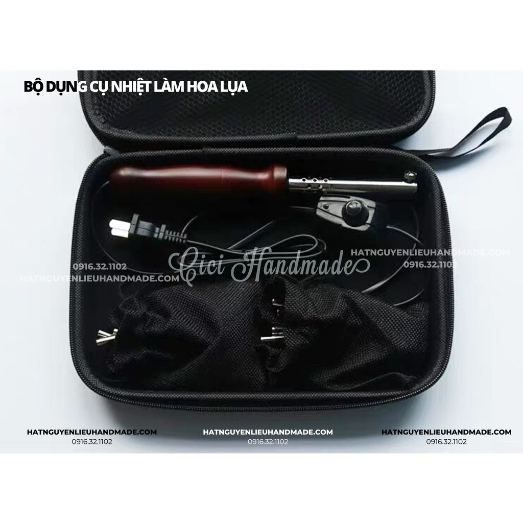 Mô tả: bộ dụng cụ làm hoa lụa gồm 1 cán nhiệt màu nâu và 17 thanh tạo hình có thể tháo rời,1 mút kê ,1 đế để cánLink hướng dẫn làm hoa và sử dụng dụng cụ: Các link hướng dẫn làm hoa dụng cụ - millinery flower making tools