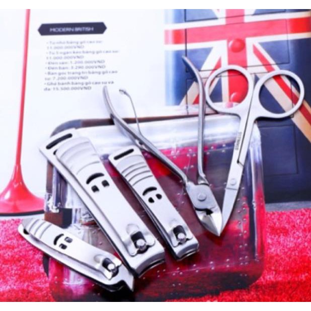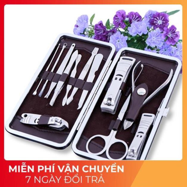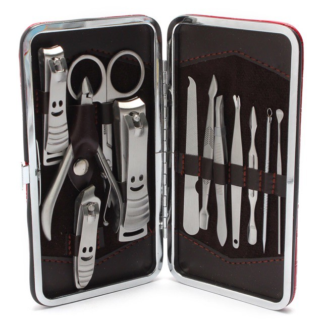 Bộ sản phẩm gồm 12 món: 1 bấm lớn, 1 bấm nhỏ, 1 kìm cắt da, 1 bấm nhọn, 1 đồ dũa móng, 1 kéo cắt tỉa lông mày - lông mũi, 1 đồ lấy ráy tai, 1 nhíp, 1 đồ lấy khóe da, 2 đồ làm sạch móng, 1 đồ nặn mụn.