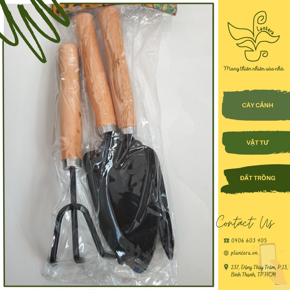 Bộ size L Kích thước: xẻng bầu 23cm, chỉa 24cm, cuốc 25cmNặng: 200g/bộ Chất liệu: cán gỗ, lưỡi thép