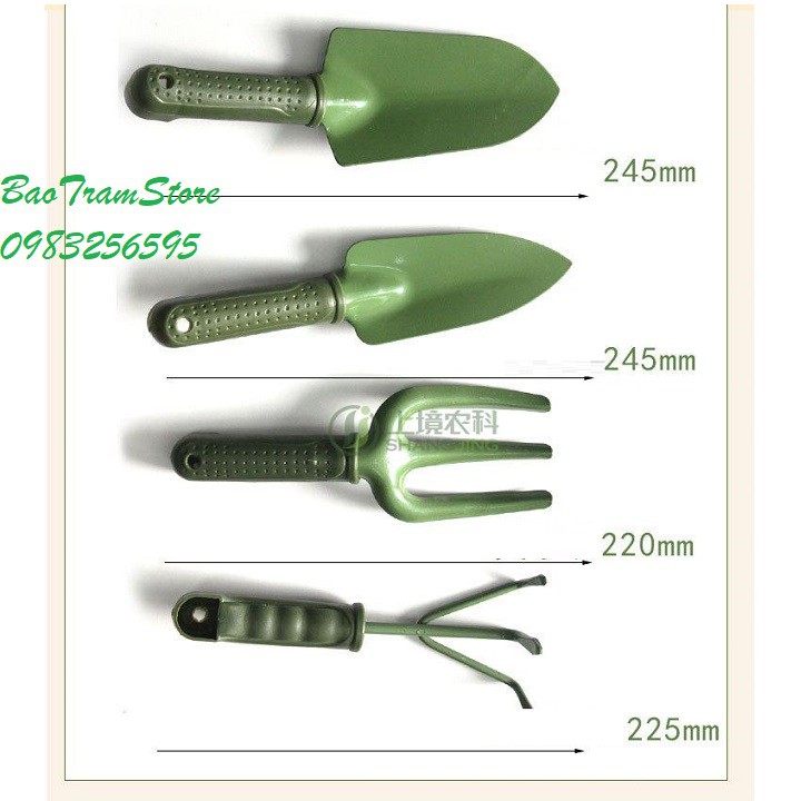 Bộ dụng cụ làm vườn 4 chi tiết màu xanh bộ đội chất lượng cao gồm có:01 xẻng xới đất dài 25cm. Lưỡi rộng 8cm, dài 15cm.