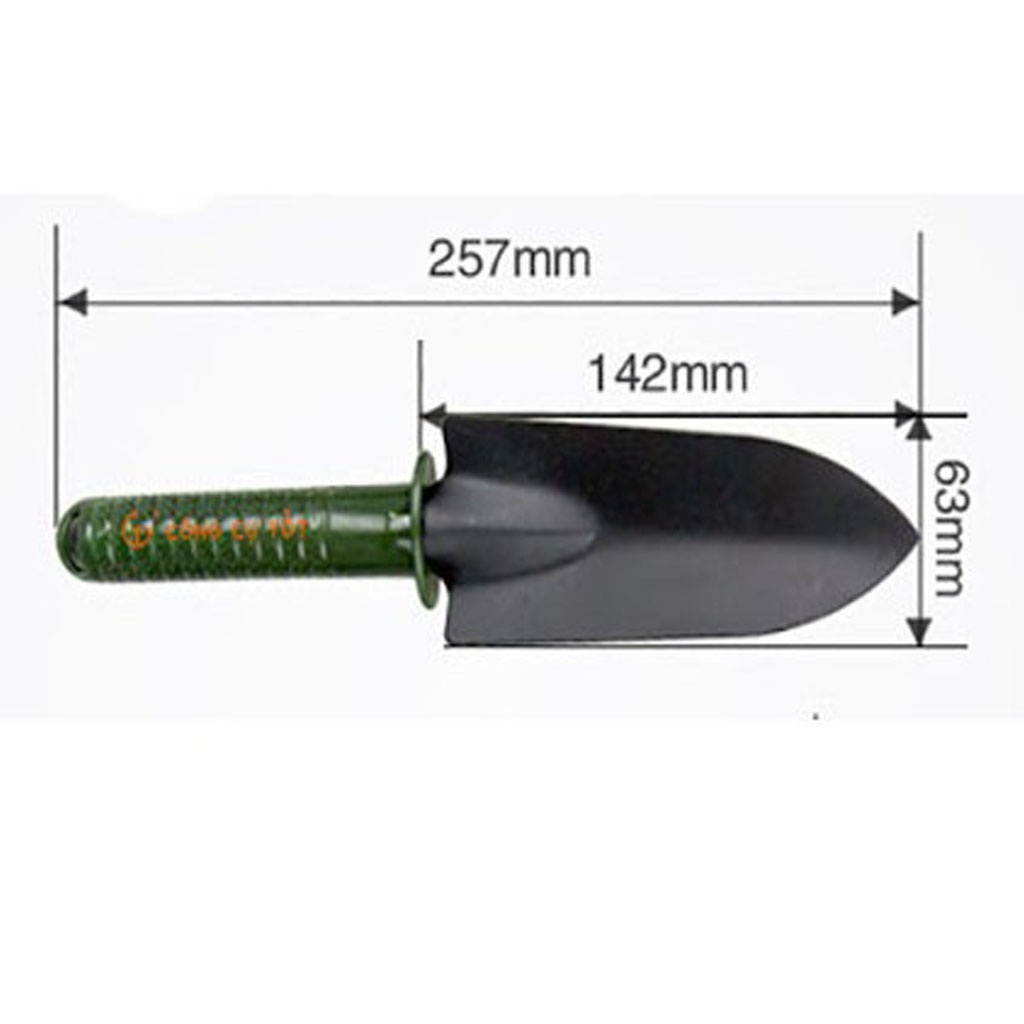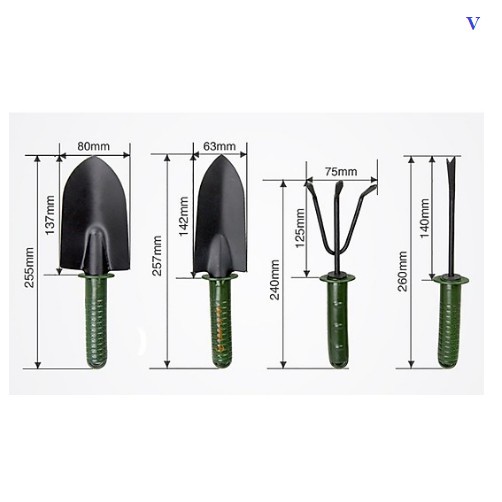 Bộ dụng cụ gồm: 1 xẻng xúc, 1 cào đất, 1 xẻng xới, 1 dùi