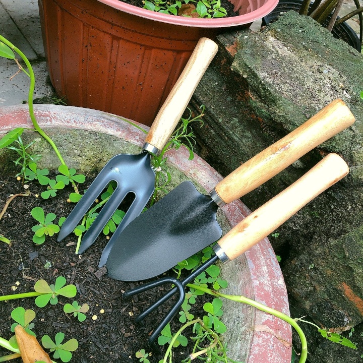 Bộ Dụng Cụ Làm Vườn Mini Cán Gỗ Garden Tool bao gồm Xẻng - Cào - Xới đất là các dụng cụ cần thiết nhất phải có khi bạn làm vườn hay trồng các loại hoa kiểng, rau sạch hay bất cứ một loại cây trồng nào. Bộ ba dụng cụ làm vườn này đang được rất nhiều người ưa chuộng và tin dùng chúng nhỏ, gọn, nhẹ và tiện lợi để thao tác làm vườn.