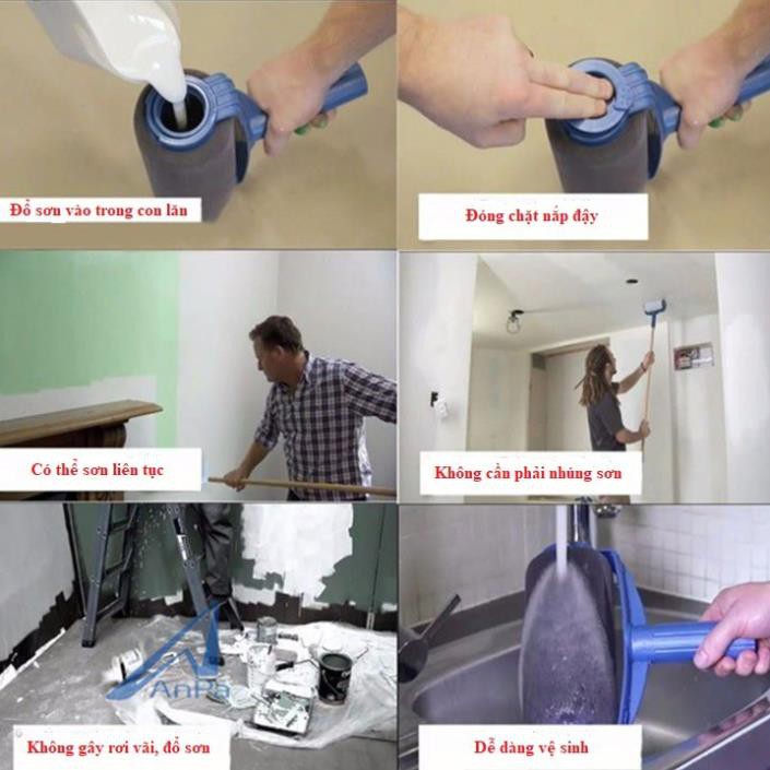 ƯU ĐIỂM SẢN PHẨM Tiết kiệm thời gian, tiền bạc phải thuê thợ trong khi nhà cửa thì lộn xộn, bẩn nhem nhuốc. Tân trang căn nhà, hồi sinh bề mặt tường chỉ trong vài phút Không để lại đường hằn trên bề mặt như khi sử dụng cọ sơn. Cọ lăn được thiết kế để sơn diện tích rộng mà không để lại vết cọ lăn hay đường hằn nào, sơn luôn được phủ đều và mịn lên toàn bộ bề mặt Biến công việc trang trí căn nhà thành công việc gia đình, để con bạn, vợ bạn cũng có thể làm chung. Bỏ qua những bộn bề công việc, cùng nhau trang trí ngôi nhà với những gam màu sắc đáng yêu, thật tuyệt vời Sản phẩm được thiết kế theo cách thông minh, sơn được đổ vào trong lòng chổi, quét sơn đều và mịn, thậm chí không bị chảy ra ngoài, tránh vương vãi. Sơn được cả các góc khó, hoặc các bề mặt đặc biệt như cửa, hàng rào với độ bám dính tốt. Sản phẩm gồm có 6 chi tiết: Con lăn lớn, con lăn nhỏ, chổi lau, chậu pha sơn, máng pha sơn,que nối dài.