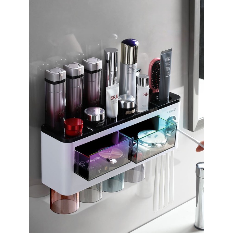 Dụng cụ lấy kem đánh răng tự động kèm kệ để đồ dùng nhà tắm thông minh có ngăn kéo đựng đồ (Kèm 4 cốc đế từ hiện đại)