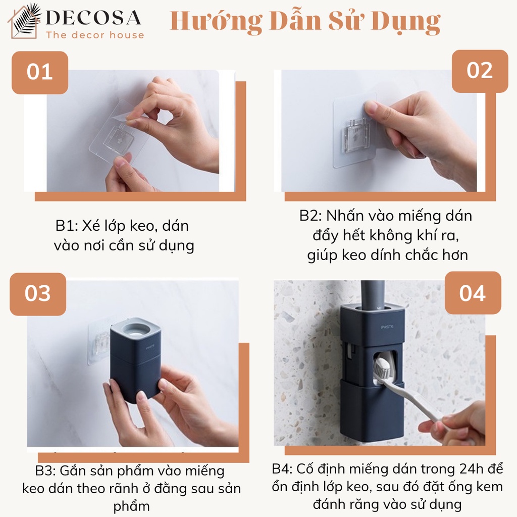 - Lột lớp keo sau miếng dán, sau đó vệ sinh bề mặt tường, cân chỉnh cho miếng dán cân đối, ép chặt vào tường và để yên trong vài giờ. Vệ sinh sản phẩm và móc vào phần đã dán, đặt kem đánh răng vào và sử dụng