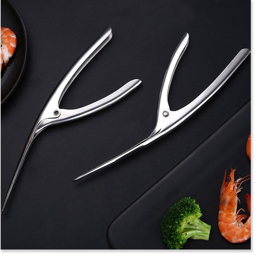+ Bạn chỉ cần cho mũi nhọn của dụng cụ xuyên sát vào phần từ lưng tôm xuống đuôi tôm. Sau đó, bạn bóp nhẹ tay cầm là phần vỏ sẽ được tách ra khỏi phần thịt tôm.