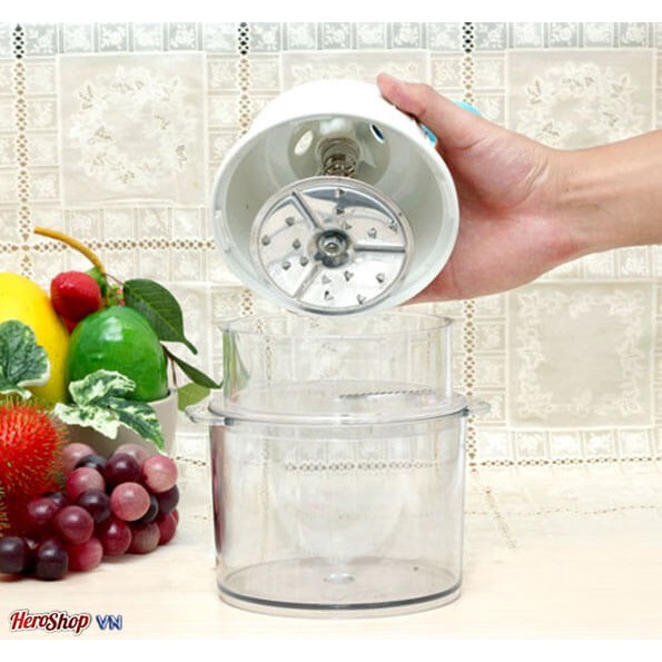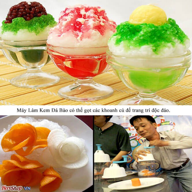- Bộ sản phẩm gồm: 1 máy và 3 tô chứa đá, rau củ.