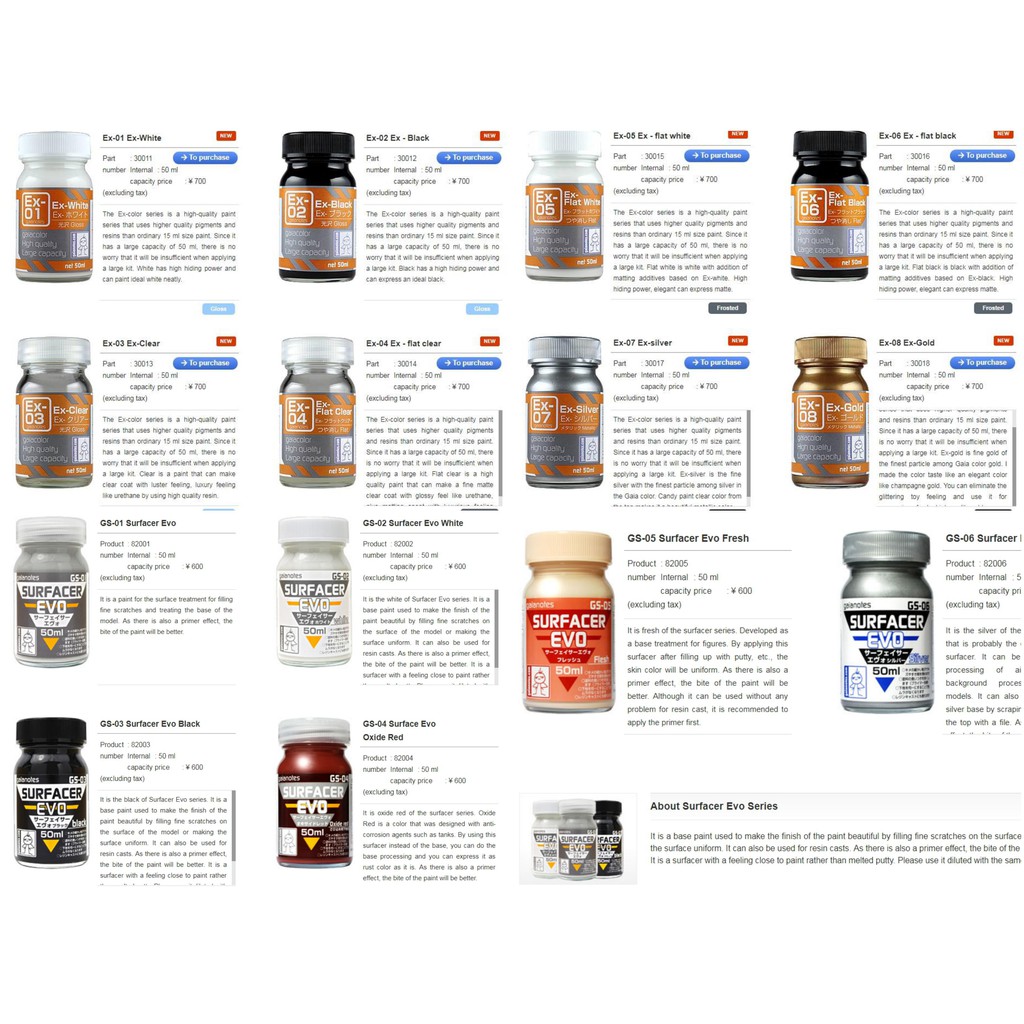 Ex-series là một loạt sơn chất lượng cao sử dụng bột màu và nhựa chất lượng cao hơn so với sơn kích thước bình thường. Vì nó có dung tích lớn 50 ml, không có gì lo ngại rằng nó sẽ không đủ khi áp dụng một bộ lớn.
