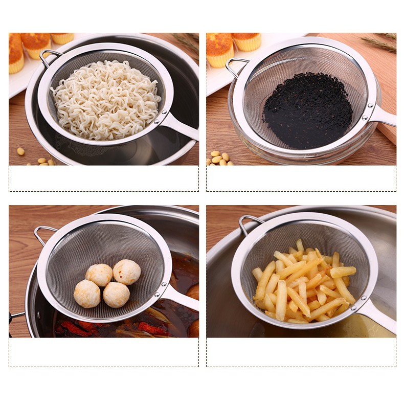 - Chất liệu inox lọc có lưới đan khít đủ để lọc nước và đồ thức ăn loãng