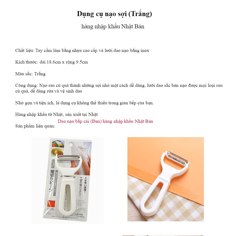 Sản phẩm làm bằng chất liệu nhựa PP cao cấp vô cùng thân thiệt với môi trường, không gây độc hại cho sức khoẻ, độ đàn hồi cao giúp tăng độ bền cho sản phẩm, lưỡi inox không gỉ rất sắc và bền. Màu sắc sang trọng:màu trắng Kích thước nhỏ gọn: 13.5 x 6 cm Sản phẩm dùng để gọt (nạo) vỏ rau, củ, quả Siều bền và an toàn cho gia đình. Thiết kế thông minh tính tế, mang vẻ đẹp sang trọng, dễ dàng cọ rửa khi sử dụng. Đảm bảo cho bạn sử dụng an toàn cho mọi người. Siêu bền, tiện lợi, dễ dàng vệ sinh.