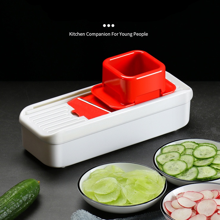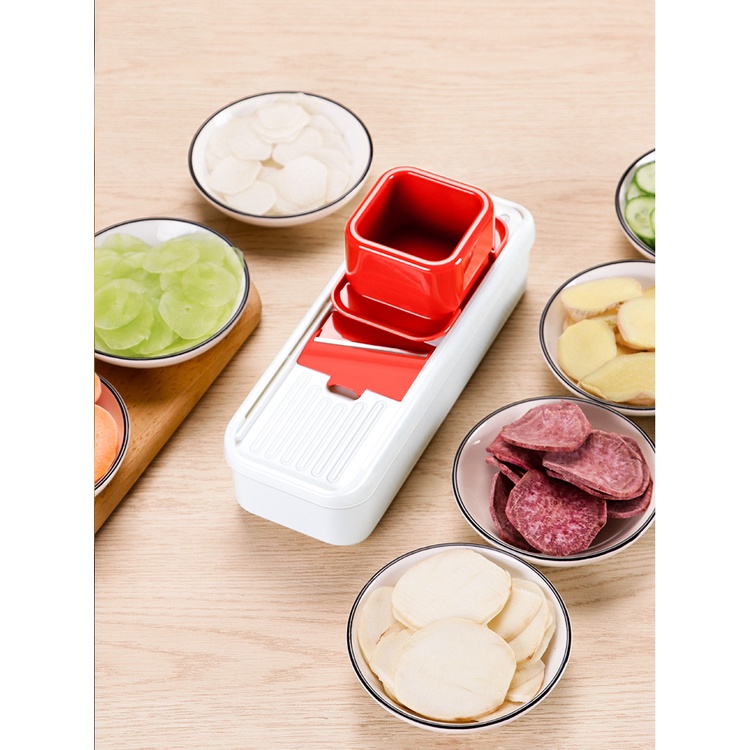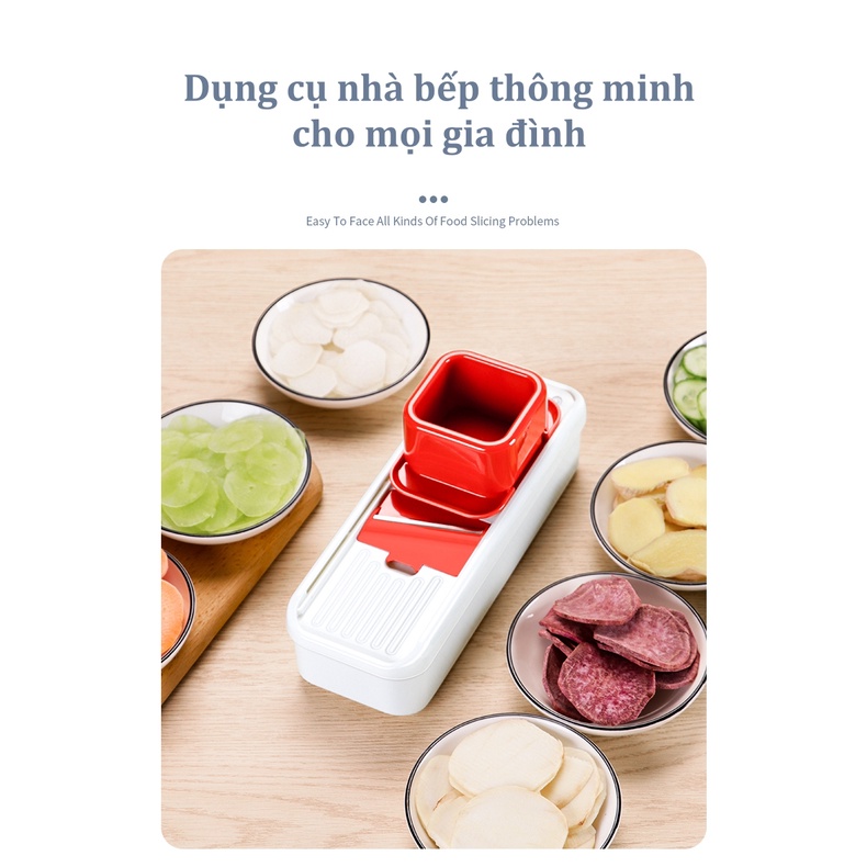Dụng cụ nạo hành, dụng cụ thái lát rau củ thông minh có núm cầm tay* Bộ dụng cụ thái rau củ gồm 4 chi tiết: hộp đựng, bàn nạo, 2 lưỡi dao thay thế, 1 núm cầm giữ củ quả