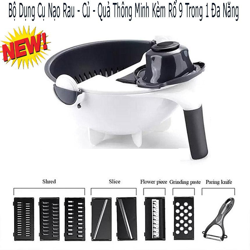 Bộ Dụng Cụ Thông Minh Nạo Rau - Củ - Quả Kèm Rổ 9 Trong 1 Đa Năng thiết kế thông minh, nhỏ gọn và nhiều chức năng với cấu tạo gồm: lưỡigọt (nạo) vỏ củ quả (củ khoai tây, bầu, bí, cà rốt, mướp, susu…); lưỡi bào (cắt) củ quả thành sợt nhỏ (Bào cà rốt, đu đủ, dừa…); rổ hứng rửa xoay 360 độ không lo bị rơi ra ngoài… giúp việc chế biến các món ăn thật đơn giản và dễ dàng và đẹp mắt.Tay cầm bằng nhựa chất lượng cao, giúp sản phẩm chắc chắn và rất bền, an toàn, dễ cầm, dễ sử dụng. Với dụng cụ nạo gọt củ quả đa năng kèm rổ bạn có thể bào nhỏ, bào sợi, nạo và rửa ngay với rổ… các loại rau củ quảtheo nhu cầu chế biến món ăn. Hỗ trợ cho công việc nội trợ của bạn một cách tối đa.