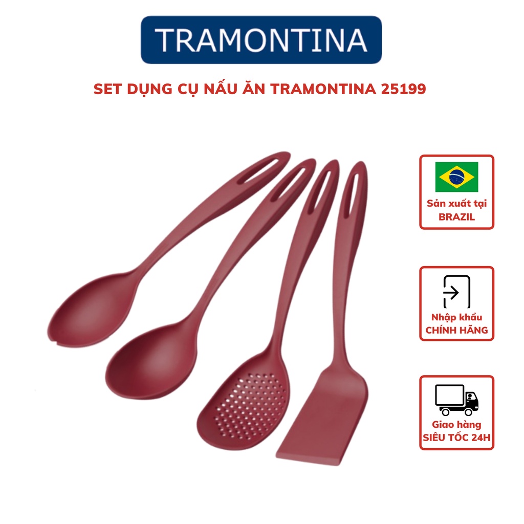 Dụng cụ nấu ăn Tramontina 25199 bộ 4 món muôi xẻng nhựa PA cao cấp chịu nhiệt tốt 3 màu nhập khẩu chính hãng BrazilTramontina là thương hiệu gia dụng hàng đầu của đất nước Brazil với lịch sử hình thành và phát triển hơn 100 năm. Hiện nay các sản phẩm thuộc thương hiệu Tramontina đã có mặt tại hơn 120 quốc gia với các mặt hàng đa dạng từ đồ gia dụng, tiện ích nhà bếp, đồ nội thất bằng gỗ và nhựa, dụng cụ nông nghiệp và làm vườn, đến dụng cụ bảo trì xây dựng, công nghiệp và ô tô…