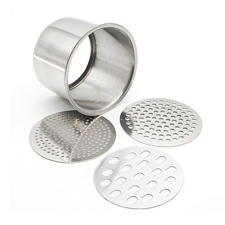 Các miếng Inox tròn, có kích thước lỗ khác nhau từ nhỏ đến to để phù hợp với nhu cầu từng món. Bạn có thể dùng loại lỗ nhỏ nhất để ép bún, cọng bún dài hay ngắn tùy thuộc vào cách ép của mình. Loại lỗ vừa để ép bánh lọt, làm chè bánh lọt hoặc bánh canh, bánh tằm bì…