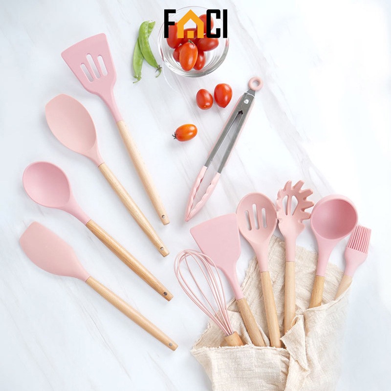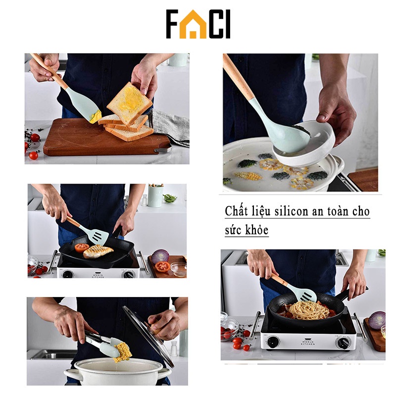 Giới thiệu Bộ dụng cụ nhà bếp 11 món chất liệu silicon chịu nhiệt 230 độ C chống trầu xước nấu ăn làm bánh tay cầm bằng gỗ