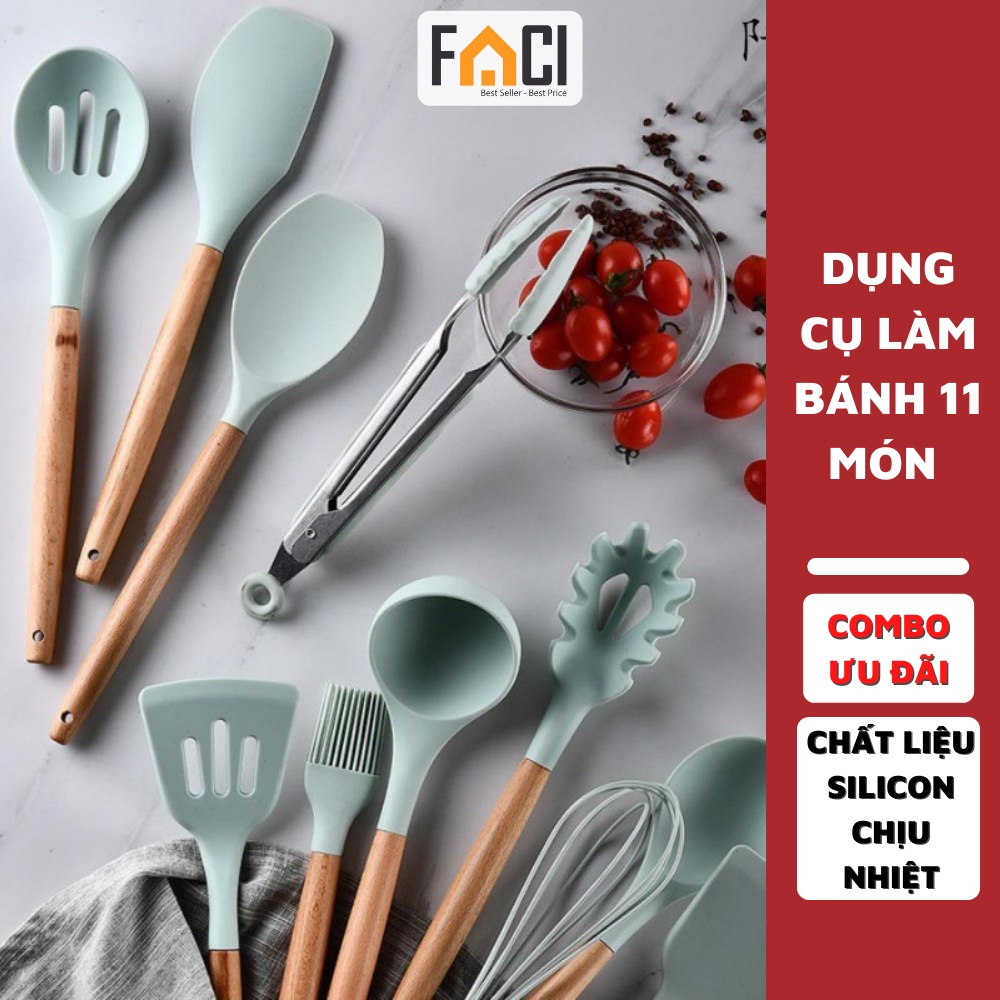 Bộ dụng cụ nhà bếp 11 món chất liệu silicon chịu nhiệt 230 độ C chống trầu xước nấu ăn làm bánh tay cầm bằng gỗ✅ Thông tin sản phẩm: