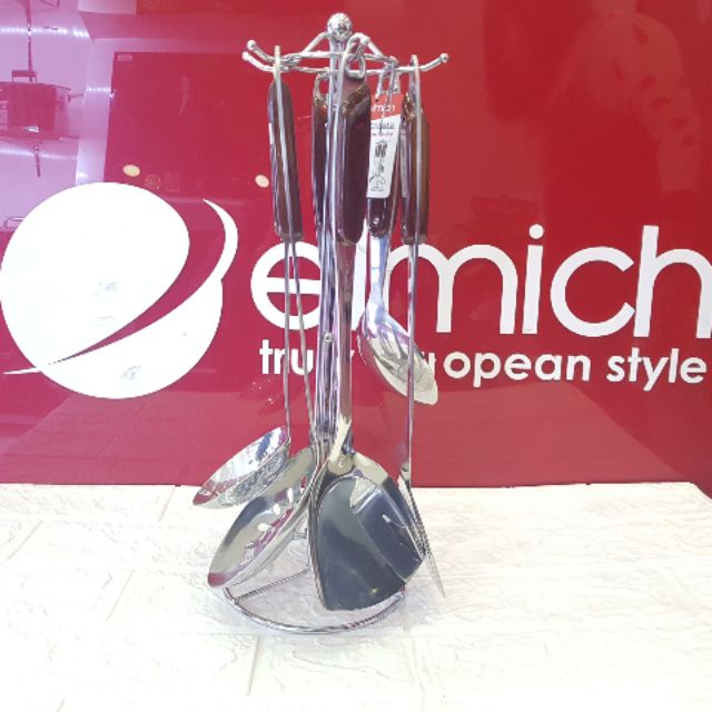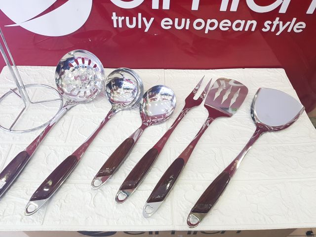 BỘ DỤNG CỤ NHÀ BẾP ELMICH INOX 7 MÓN EUBASEBao gồm 7 món: Muống canh to, Dĩa nhỏ, Xẻng lật to, Muôi thủng vớt đồ ăn, Giá treo inox