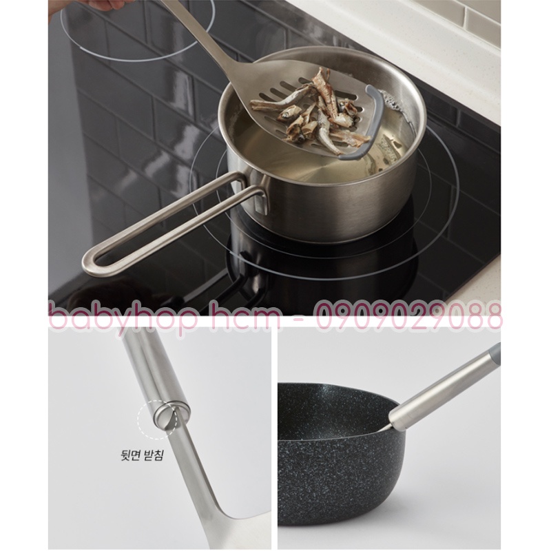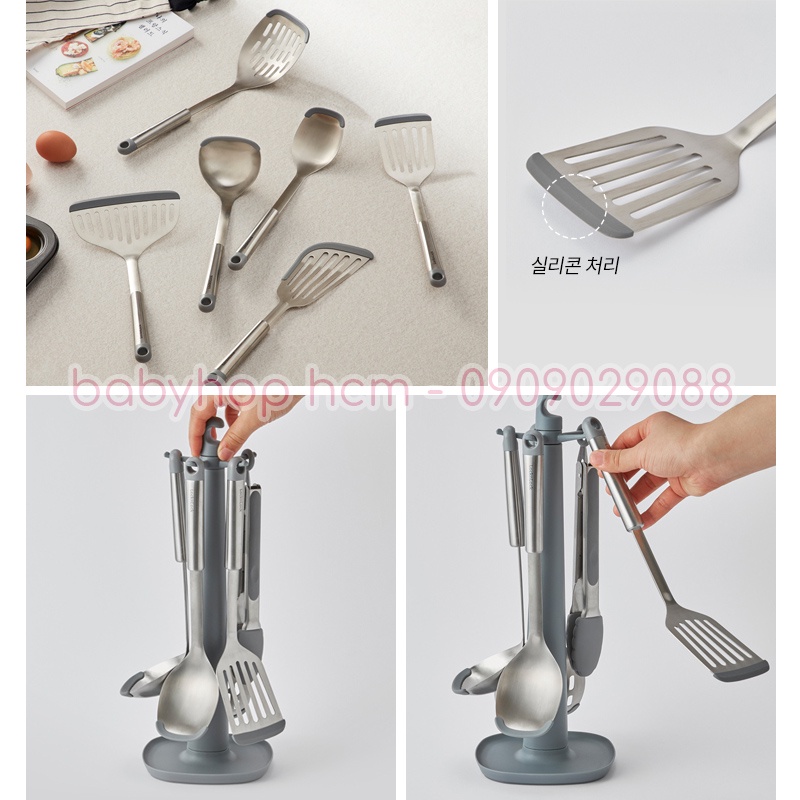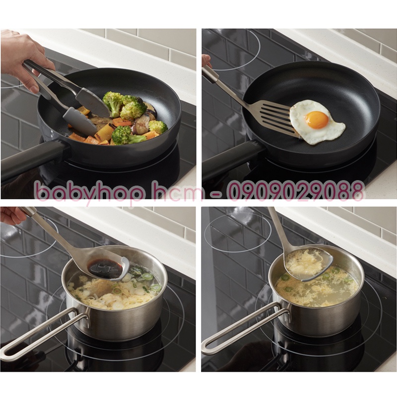 + Phần đầu dụng cụ (xẻng lật có rãnh, muôi múc canh lớn, muôi múc canh nhỏ, muôi vớt thức ăn, kẹp gắp) tiếp xúc với thực phẩm bằng silicone.