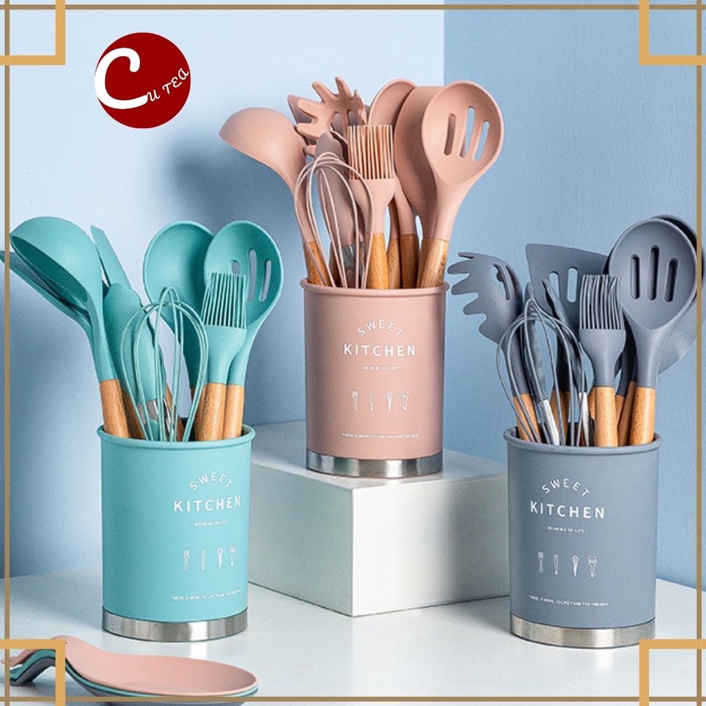 Giới thiệu Bộ dụng cụ nhà bếp nấu ăn, làm bánh 11 món chịu nhiệt cao bằng silicone chống dính phong cách Hàn Quốc CUTEA