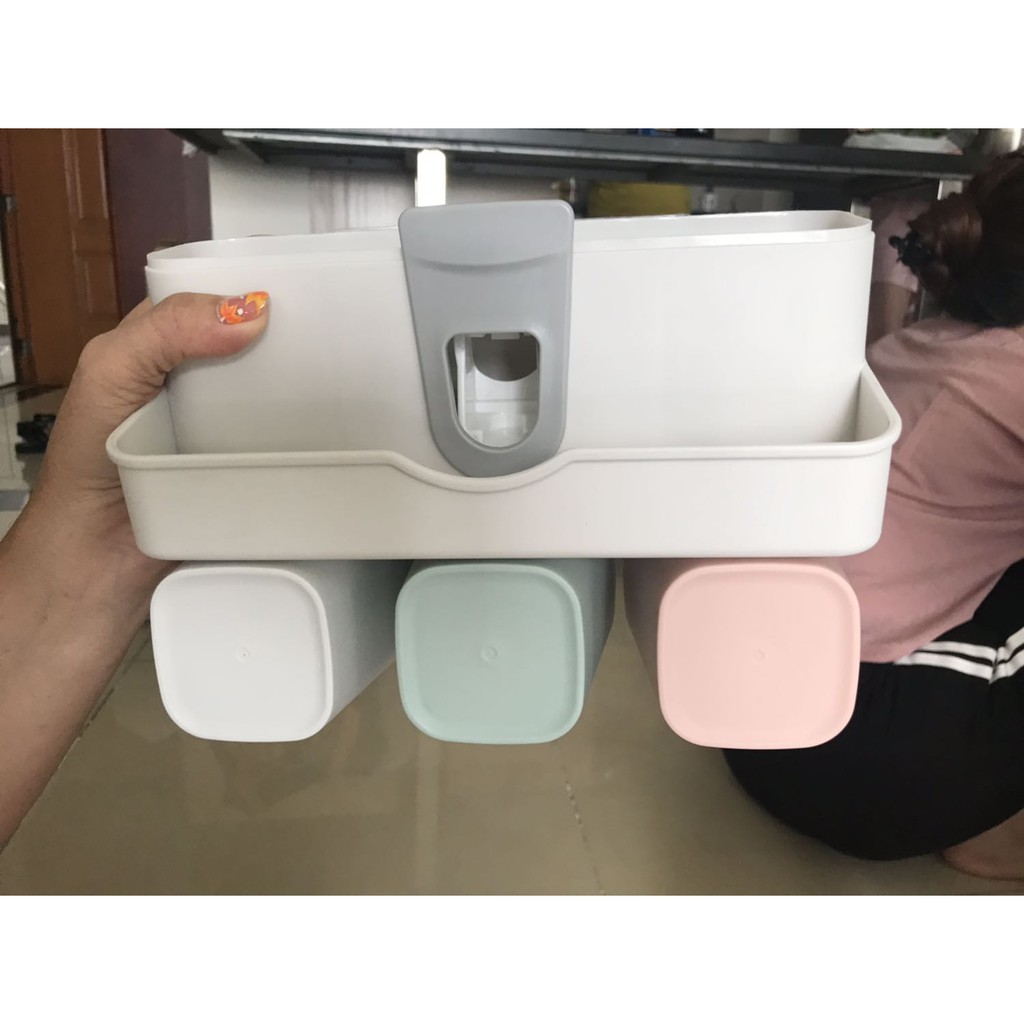 - Bộ Đựng Bàn Chải Và Kem Đánh Răng 4 Cốc với cấu tạo bên phải là dụng cụ lấy kem đánh răng vô cùng tiện lợi, phía trước là móc treo bàn chải và ly giúp giữ sạch vật dụng cá nhân khỏi bụi bẩn và vi khuẩn gây hại, còn bên trên là kệ đựng các vật dụng cần thiết như sữa rửa mặt, dầu gội, sữa tắm…hay các vật dụng nhà tắm khác.
