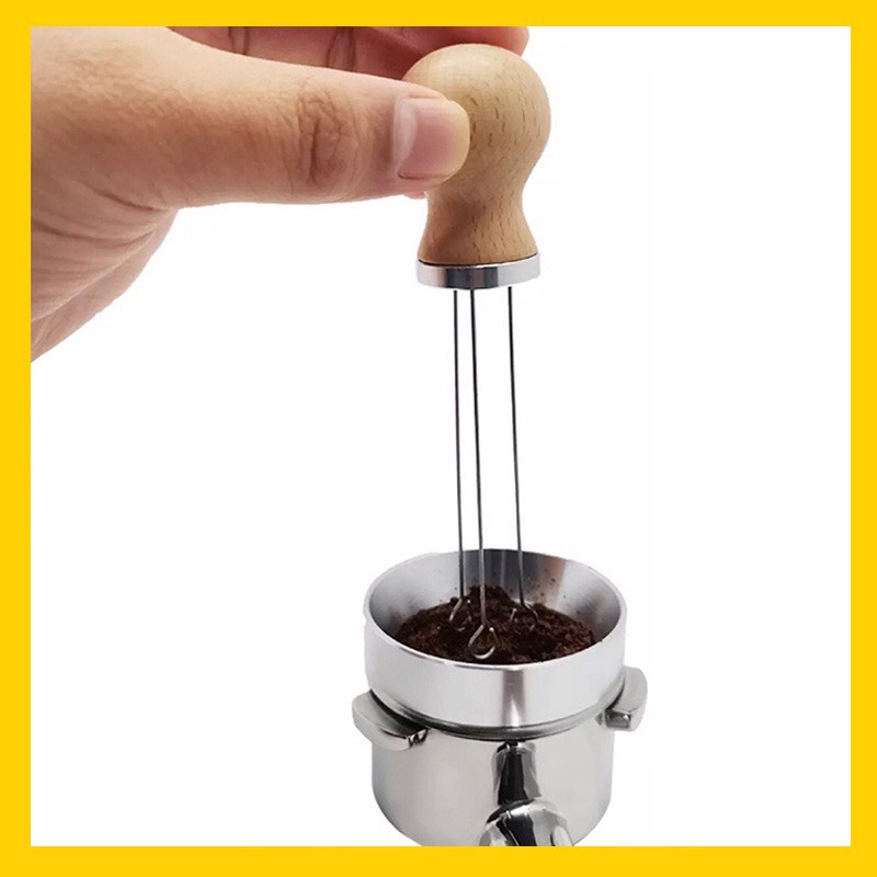- Dụng cụ đánh tơi bột cà phê: Thường thì cà phê sau khi xay ra rất dễ bị vón cục do trong quá trình xay bột cà phê bị tích điện. Nếu lúc này bạn không đánh tơi bột cà phê mà đã nén cà phê thì rất dễ gây ra tình trạng Channeling trong quá trình chiết xuất .. Chỉ mất thêm ít giây thôi nhưng sẻ giúp cho ly cà phê của bạn ngon hơn, chuẩn hơn.