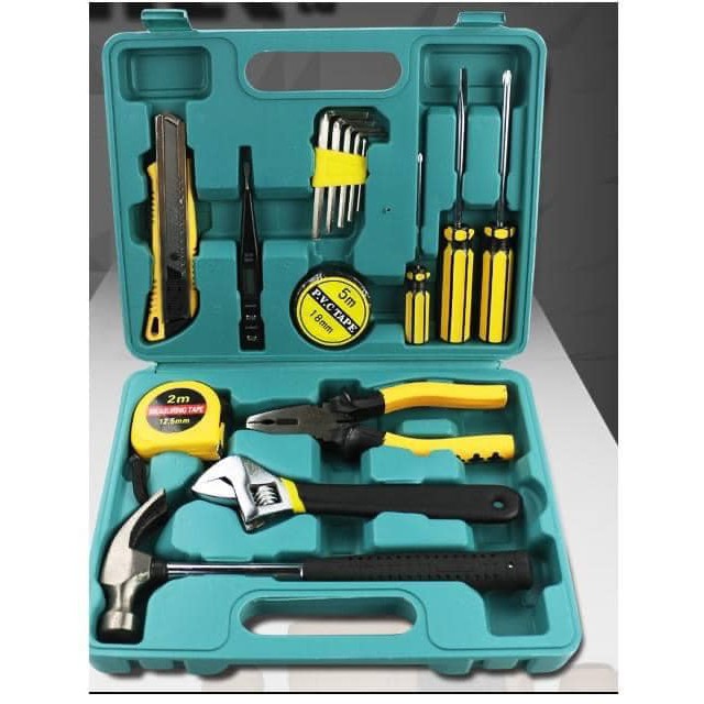 📷 Gồm 16 món: cờ lê, kềm, búa, tua vít, keo, thước, dao dọc giấy, thước kéo, băng dính điện…, công cụ hỗ trợ hiệu quả cho công việc sửa chữa các vật dụng điện trong nhà.