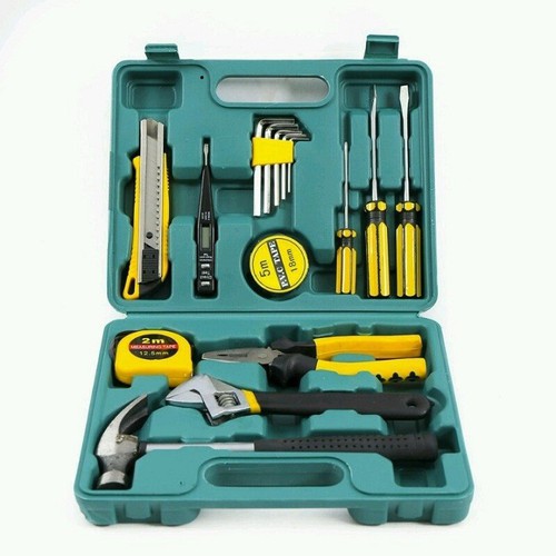01 bộ dụng cụ Gồm 16 món: 01 Búa (25cm) + 01 Mỏ lết 8’ + 01 Bút thử điện + + 01 Kìm điện (17.5cm). + 01 Dao rọc giấy cao cấp (16cm). Bộ lục giác ngoài 5 cây + 01 cuộn băng keo đen dán điện. + 01 thước kéo 2m. + 01 Tô vít đầu bằng 6’ + 01 Tô vít đầu vuông 8’ + 01 Tô vít đầu vuông 6’ và 1 hộp đựng