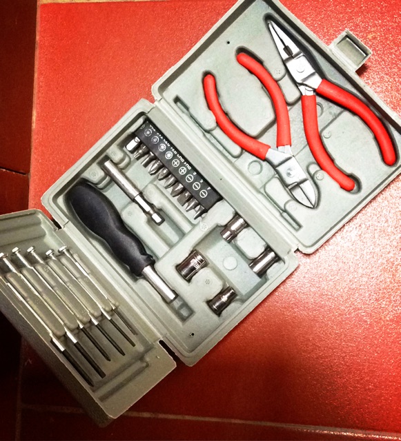 - Bao gồm: 1 dao dọc giấy /hoặc 1 kìm cắt (giao ngẫu nhiên), 1 kìm mỏ nhọn dài, 1 cán tua vít, 1 thân nối, 10 đầu tua vít, 4 đầu vặn ốc và 6 tua vít mini các loại