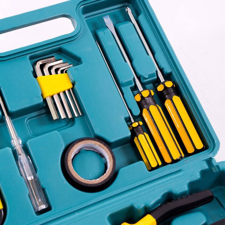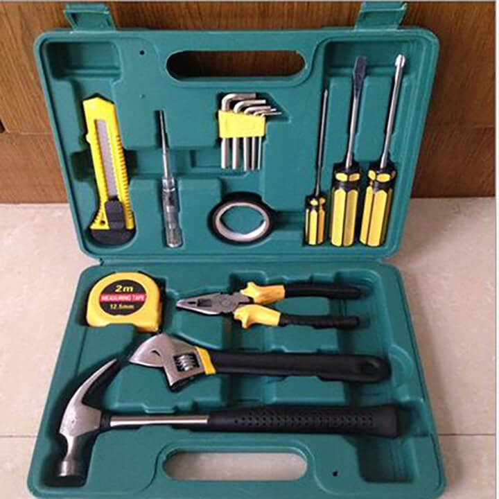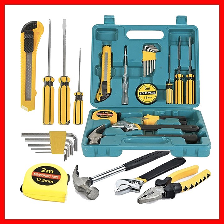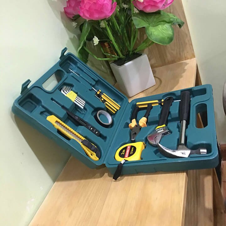 – Gồm 16 vât dụng cần thiết trong gia đình như : cờ lê, kềm, búa, tua vít, keo, thước, dao dọc giấy, thước kéo, băng dính điện…, công cụ hỗ trợ hiệu quả cho công việc sửa chữa các vật dụng điện trong nhà.