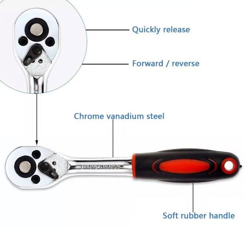 + Cờ lê đảo chiều, tay cầm tua vít, tay nối dài cứng, tay nối dài mềm giúp làm việc ở những góc hẹp.