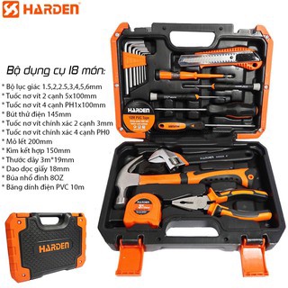 Bộ dụng cụ sửa chữa đa năng cao cấp 18 chi tiết HARDEN PRO, bộ dụng cụ đồ nghề sửa chữa, bộ dụng cụ đa năng chuyên nghiệp, thép CR-V độ bền cao, hộp đựng vali chống va đập, thiết kế gọn gàng, Tiêu chuẩn xuất khẩu châu Âu, bộ công cụ sửa chữa nhập khẩuBộ dụng cụ sửa chữa đa năng cao cấp của hãng HARDEN có công năng để sửa điện, sửa xe, sửa đồ mộc đơn giản bao gồm 18 món được lựa chọn kỹ lưỡng, chuyên nghiệp. Tất cả được đặt trong va li xách tay kích thước 30x24x8cm gọn nhẹ