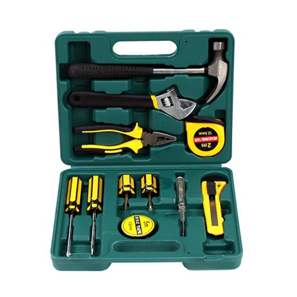 Bộ dụng cụ sửa chữa đa năng gia đình 12 món (Xanh) bao gồm các dụng cụ như búa, cờ lê, kềm, dao rọc giấy, vít bake, vít đầu bằng, băng keo điện, thước kéo... là bộ dụng cụ sửa chữa không thể thiếu cho mọi gia đình.