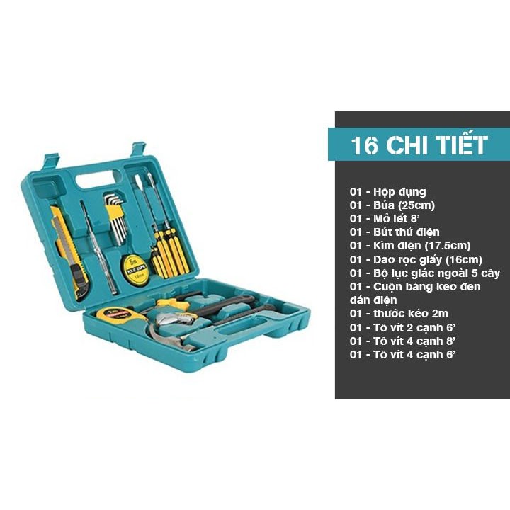 Bộ sản phẩm với 16 dụng cụ, đáp ứng cơ bản nhu cầu sửa chữa các vật dụng trong gia đình.