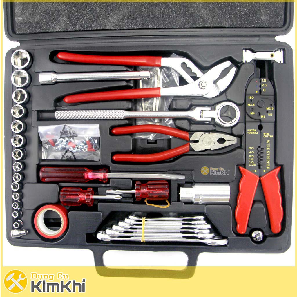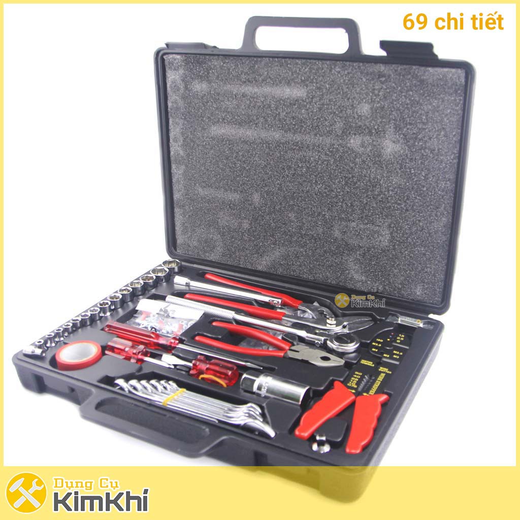 Bộ dụng cụ điện nước dùng trong gia đình với 69 chi tiết phổ biến đáp ứng các công việc liên quan đến sữa chữa điện nước dân dụng như kìm điện, kìm nước, kìm tuốt dây, tuốc nơ vít, đầu tuýp ... được bố trí sắp xếp gọn gàng trong một vali 38 x32 x 7 cm rất tiện lợi.8 đầu khẩu típ 1/4" (6.35mm): 4, 4.5, 5, 5.5, 6, 7, 8, 9mm