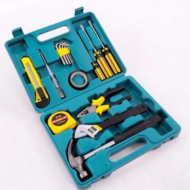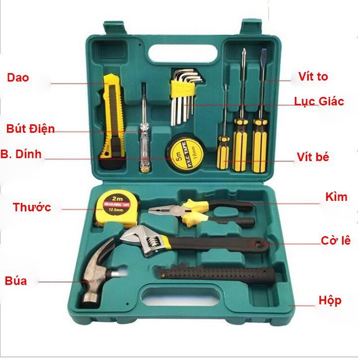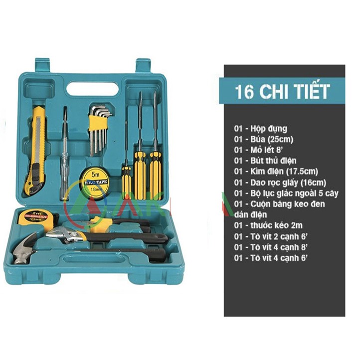 - Gồm 16 món: cờ lê, kềm, búa, tua vít, keo, thước, dao dọc giấy, thước kéo, băng dính điện..., công cụ hỗ trợ hiệu quả cho công việc sửa chữa các vật dụng điện trong nhà.