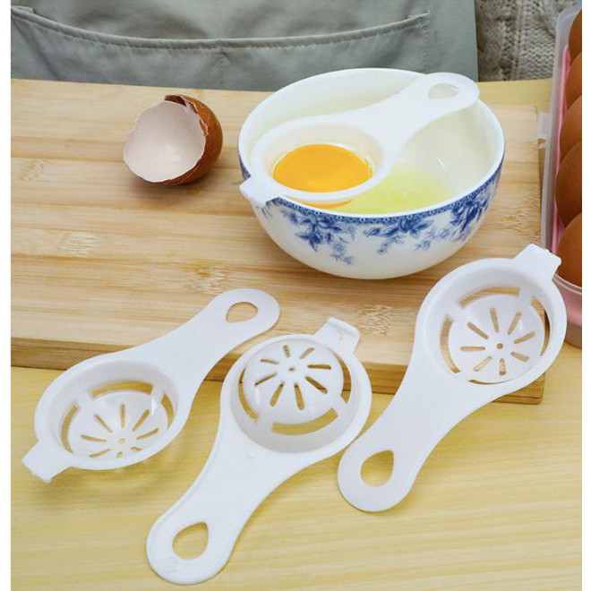 - Dụng cụ tách lòng đỏ trứng được thiết kế như một cái lưới vợt bằng nhựa. Bạn chỉ cần đập trứng vào dụng cụ tách lòng đỏ trứng này và lắc nhẹ, lòng trắng sẽ chảy xuống dưới và còn lại lòng đỏ nguyên vẹn ở trên cái vợt. Dụng cụ tách lòng đỏ trứng này đặc biệt hữu hiệu khi bạn dùng để làm bánh, chế biến một số món ăn cầu kỳ, hấp dẫn hoặc để đắp mặt nạ.