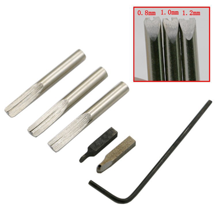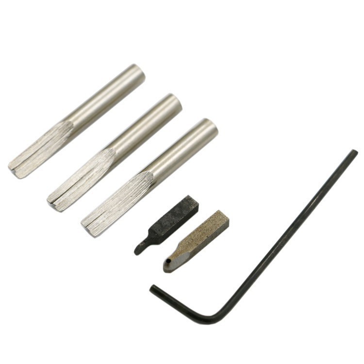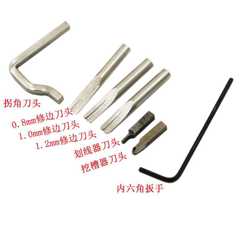 phương tiện tạo rãnh, canh lề đa năngGồm 6 đầu: một đầu lấy dấu, một đầu tạo rãnh, 3 đầu tỉa cạnh
