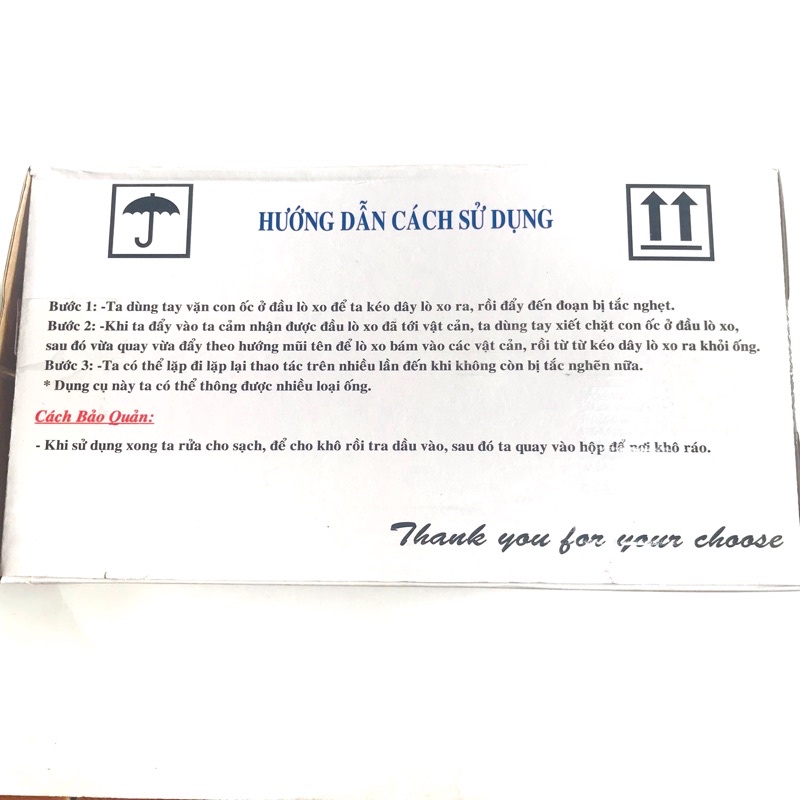 - Khi sử dụng thông ống nước bồn cầu xong nên làm khô lò xo, rồi bôi 1 lớp dầu mỏng vào lò xo để tránh bị rỉ xét, giúp bảo dưỡng sản phẩm để có thể tái sử dụng được nhiều lần về sau