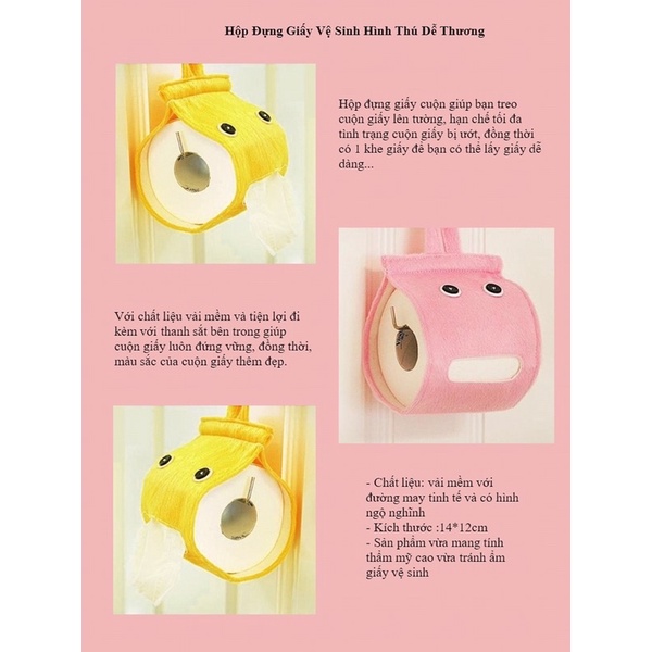 - Dụng cụ treo giấy vệ sinh ngộ nghĩnh được làm từ chất liệu vải không dệt, bên ngoài có một lớp vải bông giúp bạn bảo quản các cuộn giấy vệ sinh hoàn toàn không bẩn, bị làm ướt bởi vòi tắm hoa sen hay tác động của nước.- Sản phẩm thiết kế đẹp mắt với hình ngộ nghĩnh cùng màu sắc tươi tắn như hồng, vàng, xanh…, giúp không gian phòng tắm, nhà vệ sinh của bạn trở nên sinh động hơn bao giờ hết.