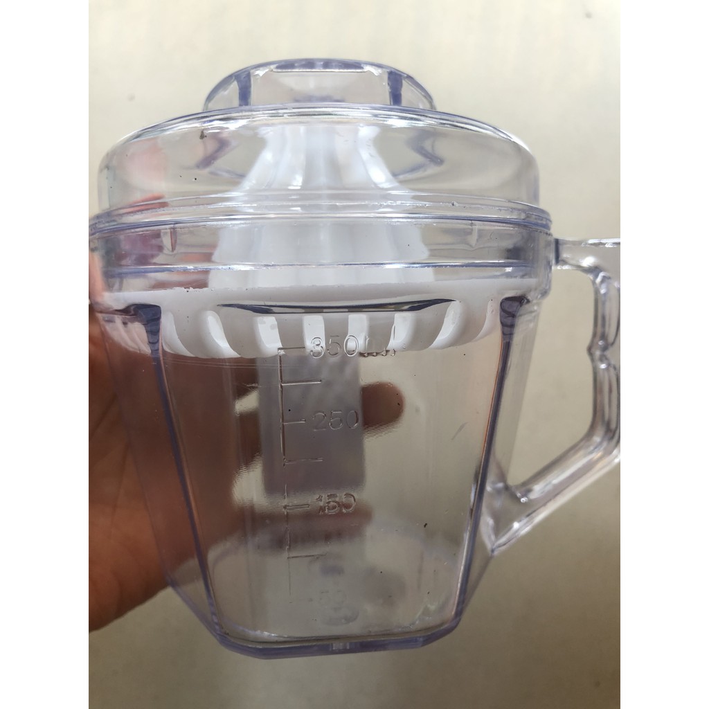 - Thể tích cốc đựng tối đa 350ml, được chia thành nhiều nấc với thước đo hiện rõ trên thân cốc để bạn thuận tiện quan sát. Ca vắt cam nhựa có rây lọc và nắp đậy | Dụng cụ vắt cam